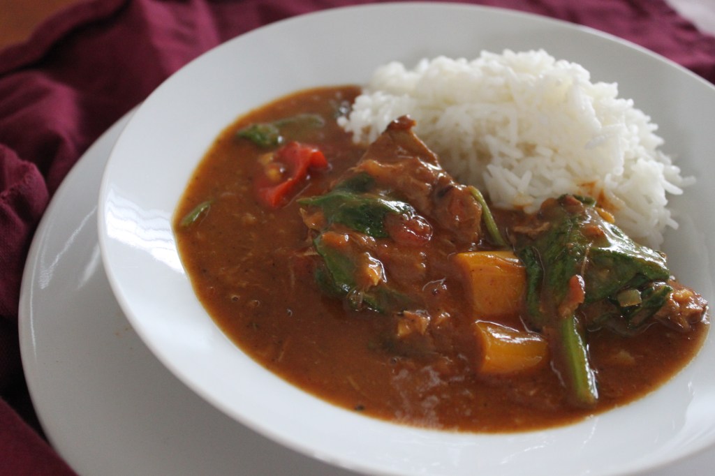 Carefully remove the lamb bone and take off any meat left on the bone. Add it to the chunked lamb you set aside earlier. To the pot, add the meat along with the chopped pepper, coconut milk and mango chutney. Bring back to the boil and lower the heat to simmer. Cook uncovered for 1.5 – 2 hours, stirring occasionally. Add a splash of water if the sauce reduces too much.