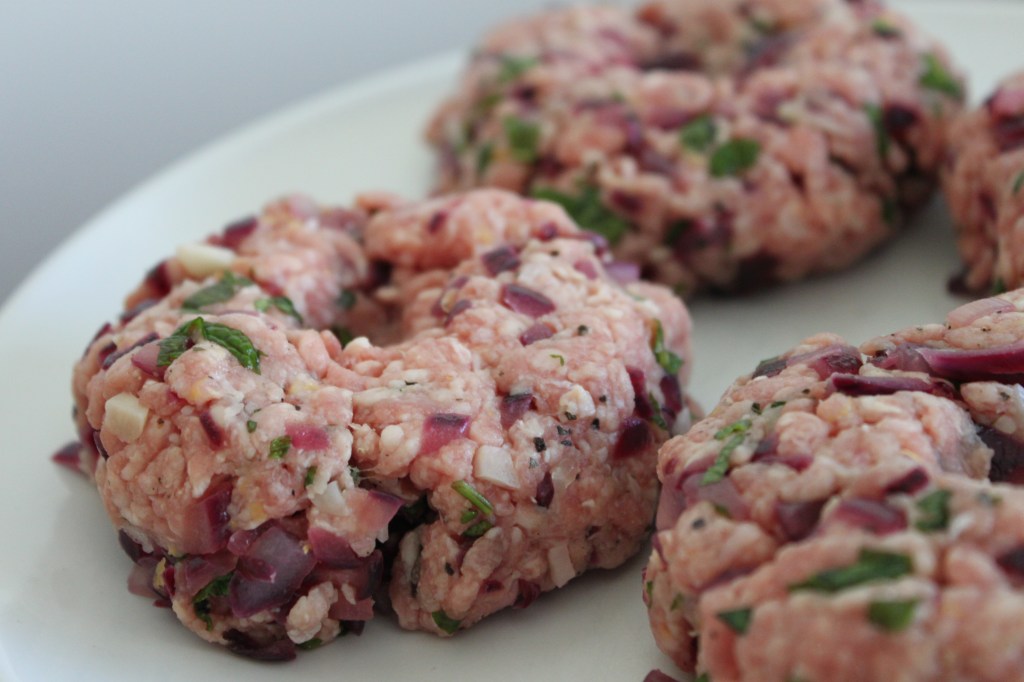 When the onion has cooled, grate in the zest of one lemon. Add the juice of half the lemon, the chopped mint and a generous pinch of salt and pepper. Mix this together, then add the lamb and use your hands to combine. Form into four burgers and refrigerate for half an hour, or up to two days.