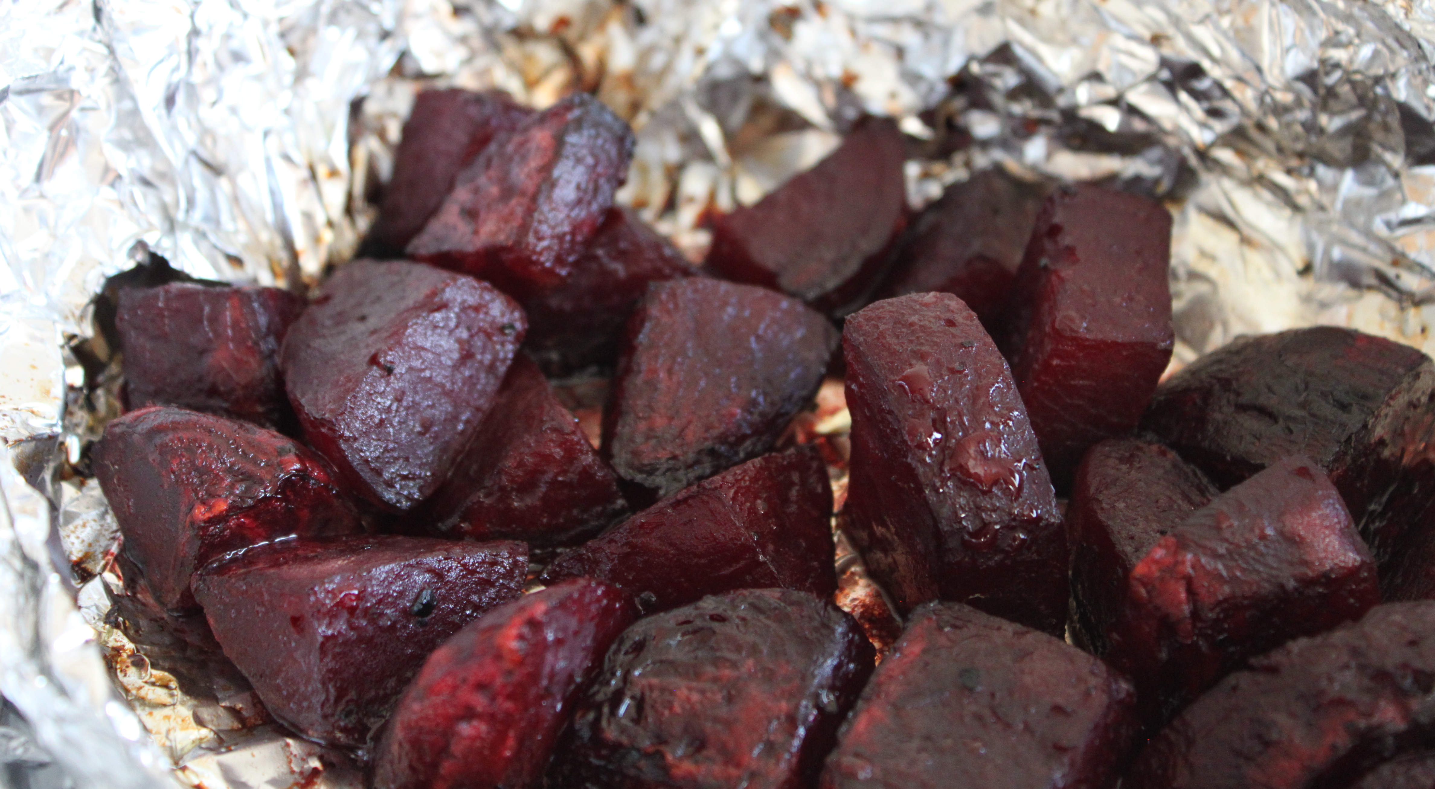 Peel the beetroot and cut into 1 inch chunks. Transfer the beetroot chunks to a double layer of tin foil set on a baking sheet. Drizzle over the olive oil and sprinkle generously with salt and pepper. Bundle up the tin foil and seal tightly to create a pouch.