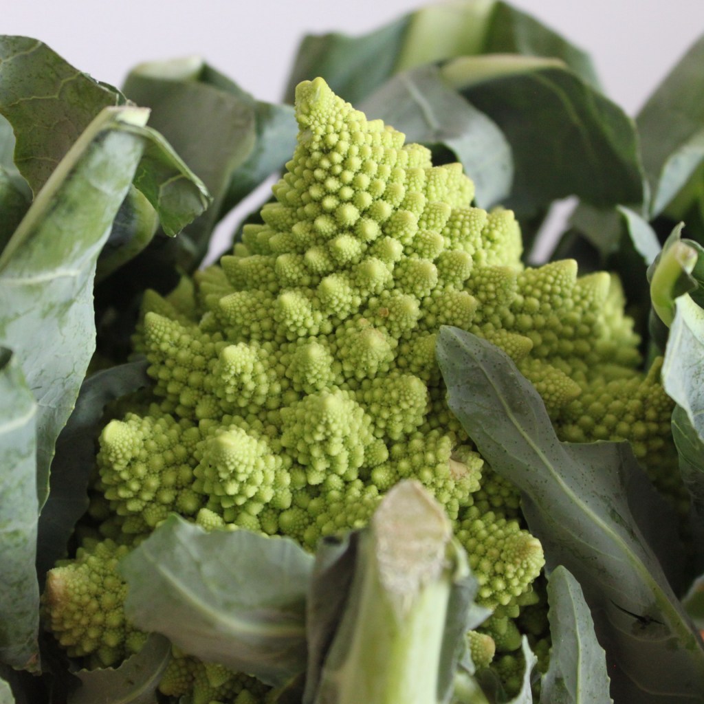 Romanesco is an old species of vegetable, somewhere between cauliflower and broccoli in taste. Think of it as the heirloom tomato of the Brassica family. A real life expression of the Fibonacci pattern, its beauty and detail are truly spectacular.