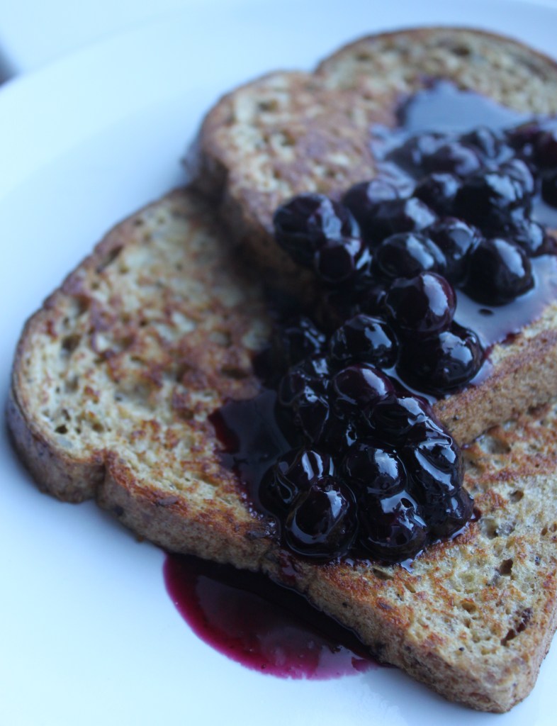 For the French toast: In a shallow dish, add 2 eggs, 1/4 cup milk, 1 tsp vanilla extract, a sprinkle of cinnamon, 1 tsp sugar and a small pinch of salt. Whisk to combine. Preheat a nonstick pan over a medium heat and add a tiny swipe of butter. One at a time, gently dip slices of bread in the egg mixture and flip over, giving it a couple seconds a side to soak up the egg. Cook in the pan on both sides, flipping once or twice, until golden. Keep warm in a low oven while you cook the rest of the slices (this recipe will make 4 – 5 slices of French toast). Serve with the blueberry syrup and (optional) sliced banana.