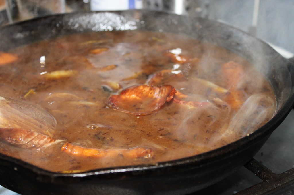 Add 2 tbsp of flour to the remaining fat and the dark, sticky vegetables (if applicable). Stir it around until it sizzles. Keep frying until the flour paste is dark and rich (2 – 5 minutes), scraping up the sticky bits on the bottom. Stirring constantly, add the stock and bring to a simmer. Continue scraping the bottom to get all the caramelized brown bits incorporated into the gravy – that’s where all the flavour is. Once simmering, reduce the heat and cook down for 20 – 30 minutes or until thick, dark and rich. At some stage fish out the half lemon from the chicken cavity and squeeze the juice and pulp into the gravy, discarding the lemon afterwards.