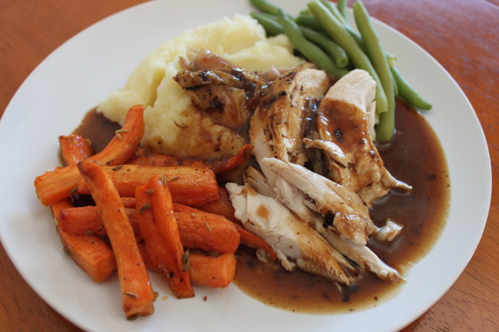 My dinner pictured above includes mashed potatoes, carrots roasted with honey and fennel, and steamed green beans. Other personal favourites with a roast chicken are roasted sweet potato and steamed broccoli, or boiled and buttered cabbage, but I’m not above a tin of corn kernels either. Sides with a roast chicken aren’t nearly as proscriptive as with a proper roast beef; just use whatever you have lying around that needs eating.