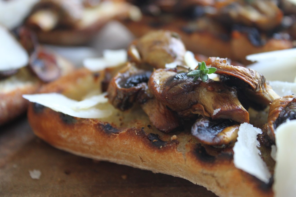Slice the ciabatta into four thin slices and use a pastry brush to paint one side lightly with olive oil. Toast both sides on a griddle pan or under the broiler (oven grill). While hot, rub the oiled side of the toasts with the cut side of a garlic clove. Divide the mushrooms across the toasts and, using a vegetable peeler, shave some parmesan on top. Either leave the slices whole or cut in half, depending on the size you want, and serve.