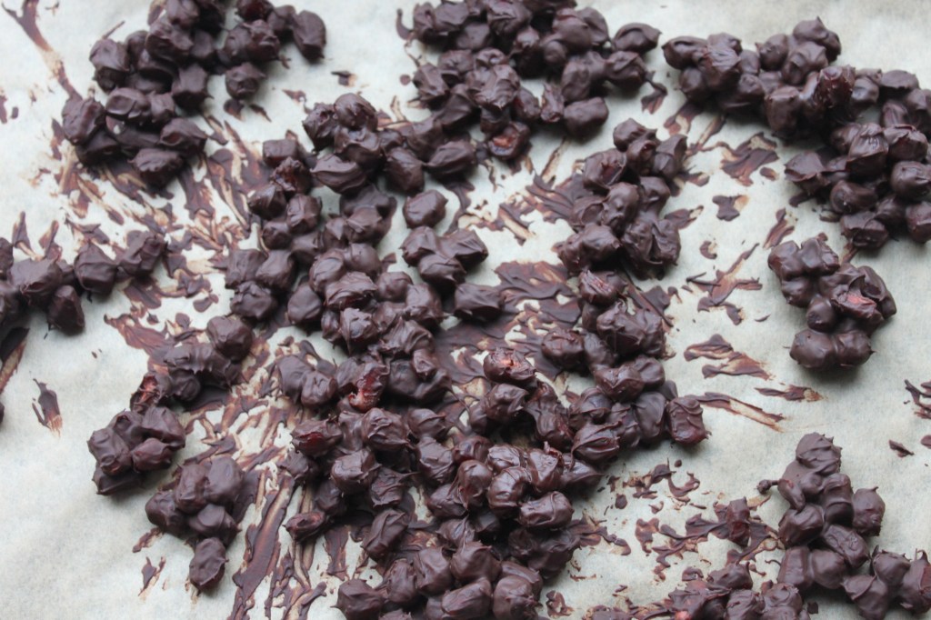 Over a double boiler (heatproof bowl over a pot of barely-simmering water), melt the chocolate. Remove and set aside. Tumble in the pomegranate seeds and stir around until coated. Tip out the mixture onto the parchment, spreading out with a fork. Pop in the refrigerator to cool and firm up. Keep refrigerated.