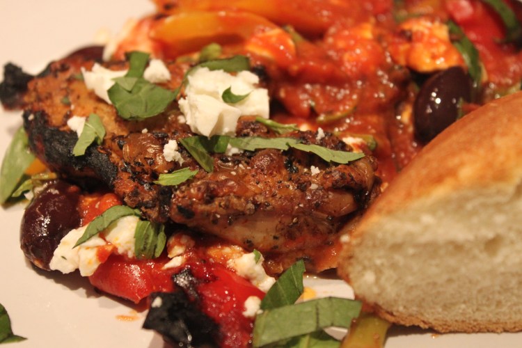 Remove from the oven and add the olives and feta, and sprinkle the basil over the top. Serve with crusty bread.