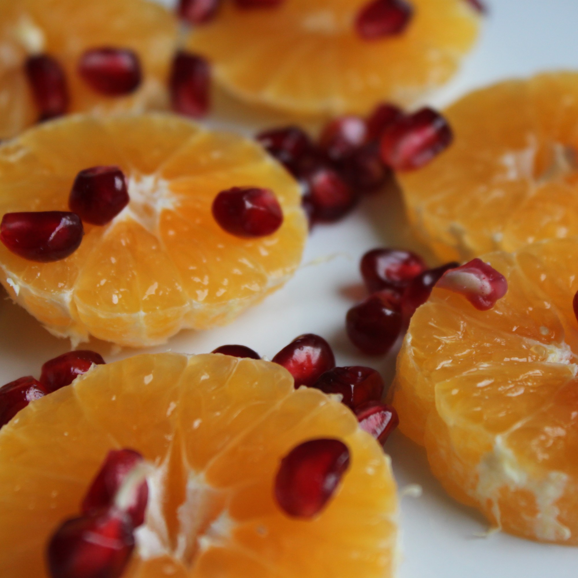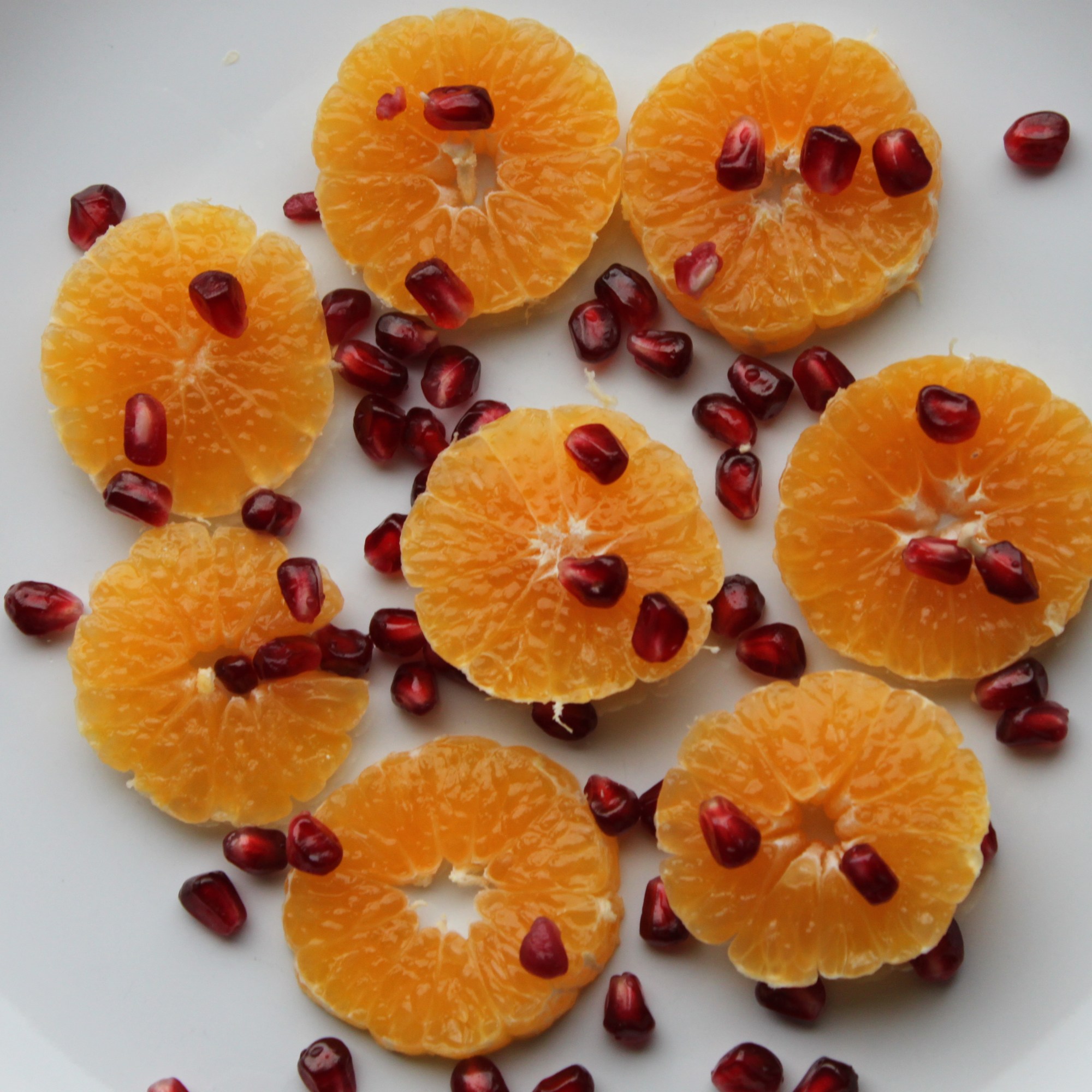 Peel the clementines in the usual way, taking care to keep the fruit whole. Turn the clementine on its side and using the sharpest knife you have, slice the clementine through the centre into four slices (as pictured, above). (If your knives aren’t sharp enough, try a serrated knife using a long, gentle carving motion.) Lay the clementine slices on a plate or platter. Scatter over the pomegranate seeds and serve within an hour or so.