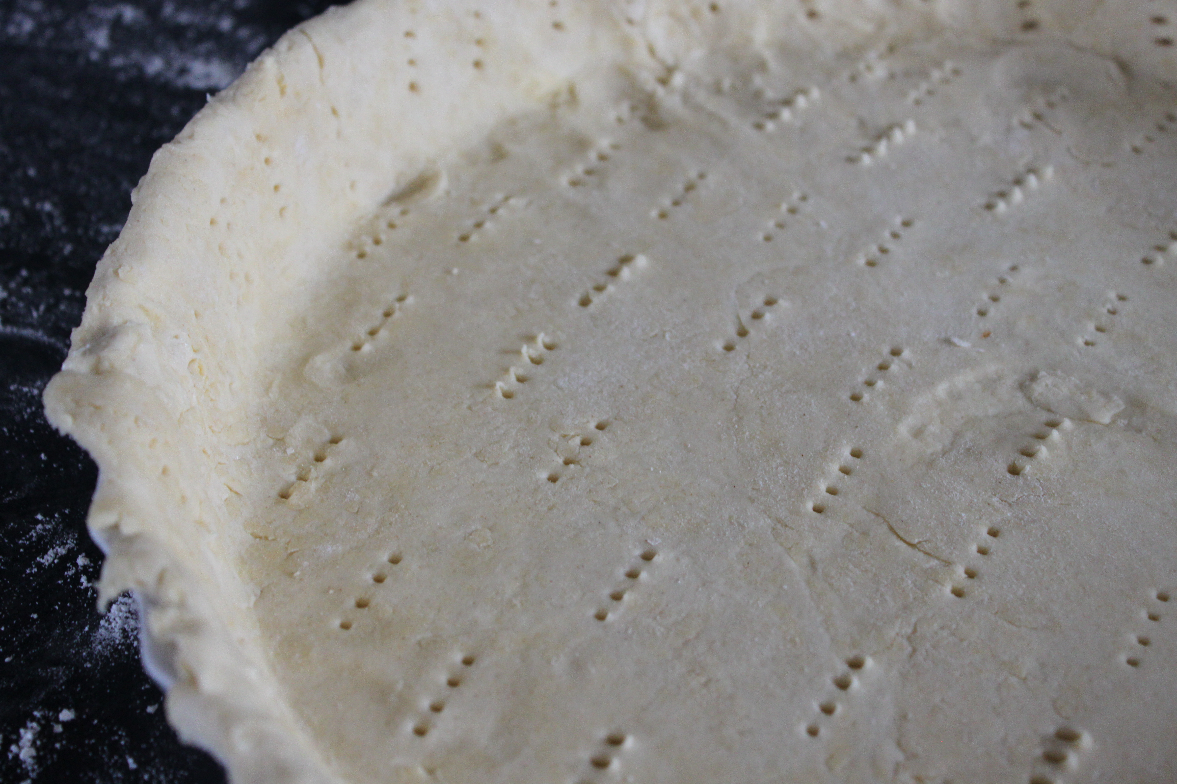 Roll out the pastry on a floured surface, dusting a little more flour as you go and rotating the pastry to make sure it’s not sticking. Loosely roll the pastry around the rolling pin and transfer your baking dish. Let the pastry fall in and up the sides, trying not to stretch the pastry as you go.