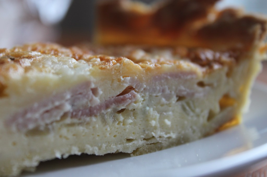 To the base of the pastry shell, add a layer of finely chopped shallots, ham and the grated cheese.