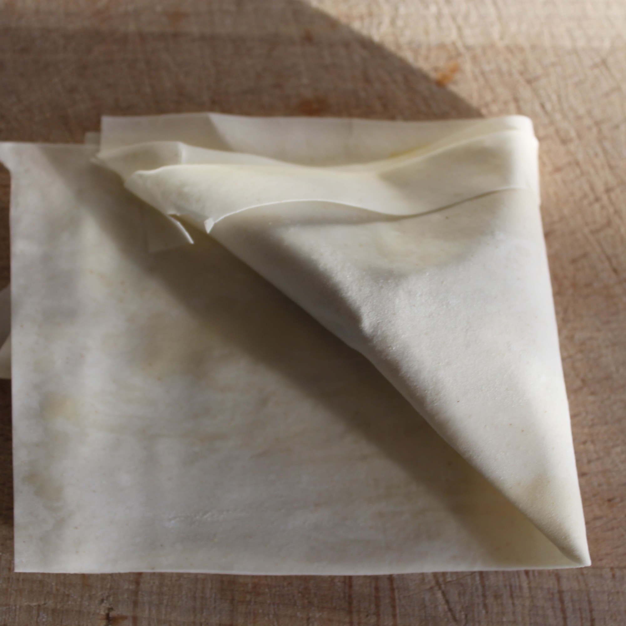 Start by laying out a sheet of phyllo on your chopping board. Brush lightly with melted butter, then lay another sheet on top. Repeat until you have three layers of pastry. Cut the pastry into quarters, then cut each quarter in half lengthwise to give you eight strips.