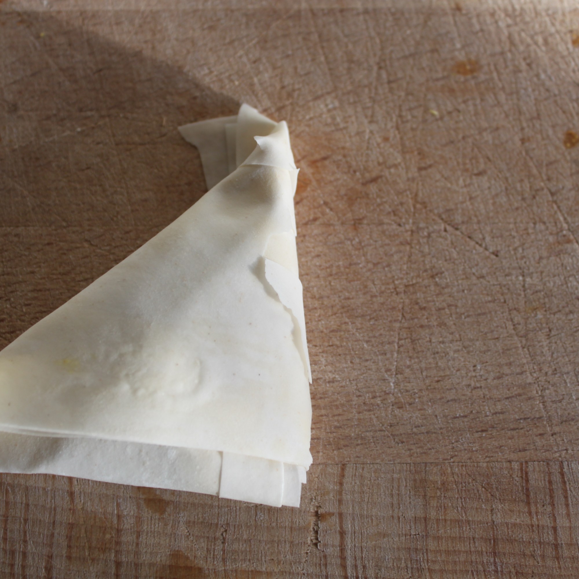 Place a heaped teaspoon of the curry – making sure to get some chicken and fruit in each – at one end. Fold into triangles by folding up on the diagonal (see photos, below). Arrange on a baking tray and cover with the damp towel while you carry on with the rest. Keep going until you run out of pastry, curry or both!