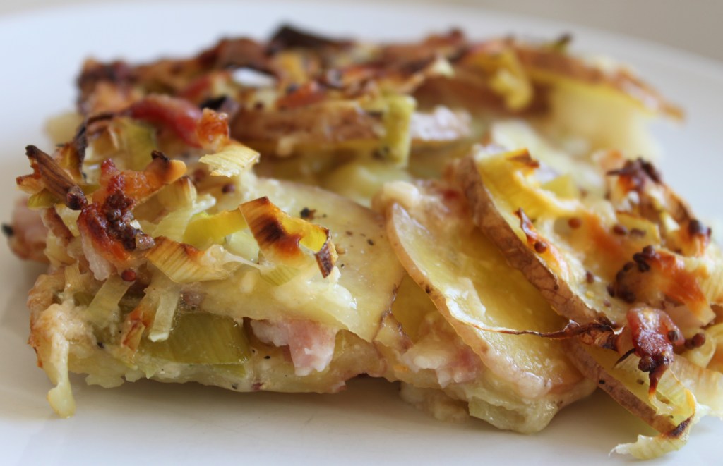 To assemble the gratin, start with a layer of slightly overlapping potatoes. Season the potatoes with salt and pepper, then sprinkle over 1/3 of the chopped leeks, 1 of the chopped rashers of bacon and 1/3 of the cheese mixture. Repeat until you have three complete layers, ending with cheese.