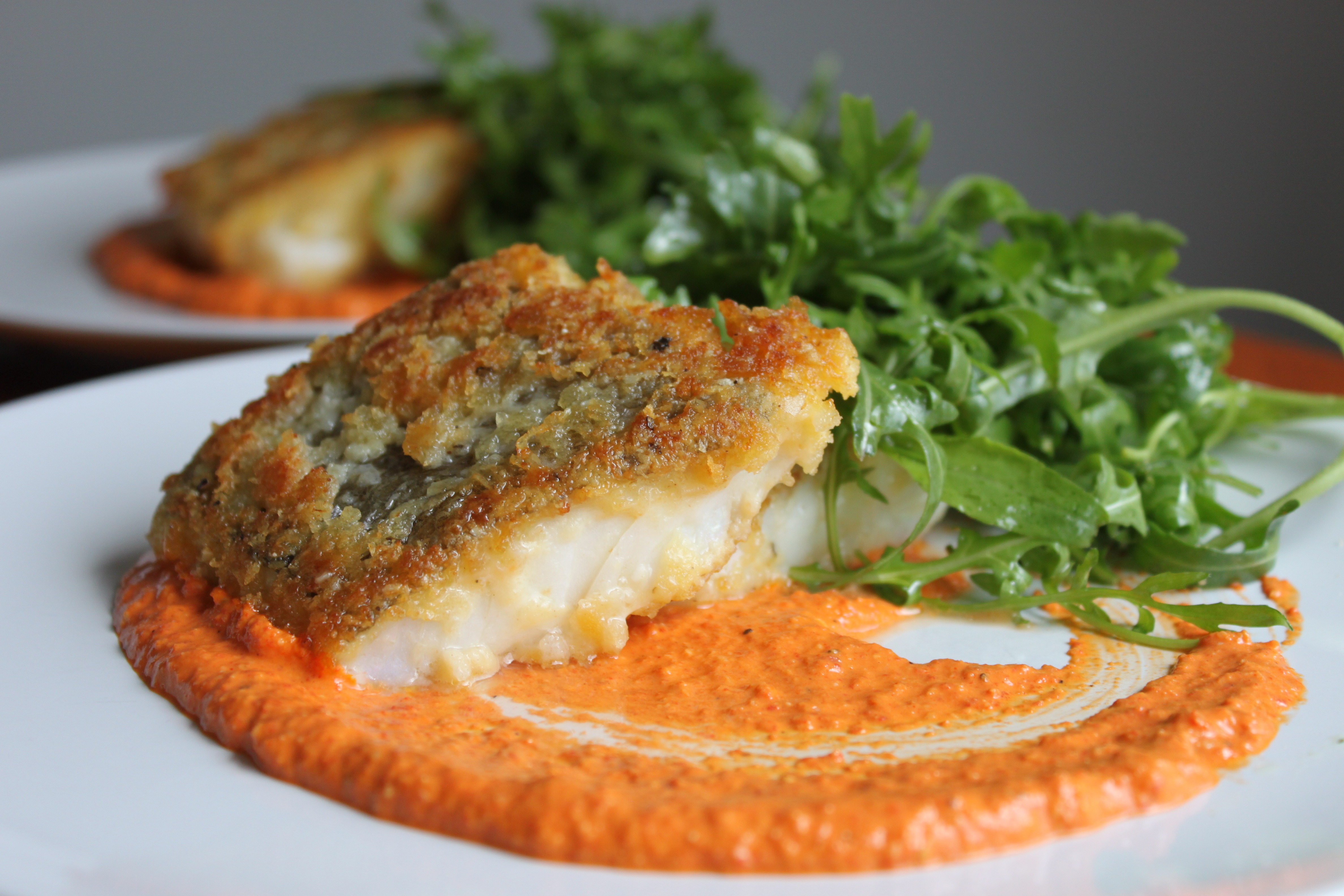 Crispy Cod with Pine Nut Romesco Sauce and a Rocket Salad