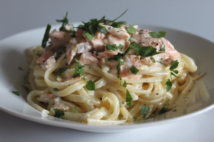 When the salmon has had its time, remove from the oven and use a fork to flake roughly. Discard the skin. Don’t be alarmed if the fish seems undercooked at this stage – it will be fully cooked by the time you eat. Cover the flaked salmon with the foil lid to keep warm while the pasta finishes cooking.