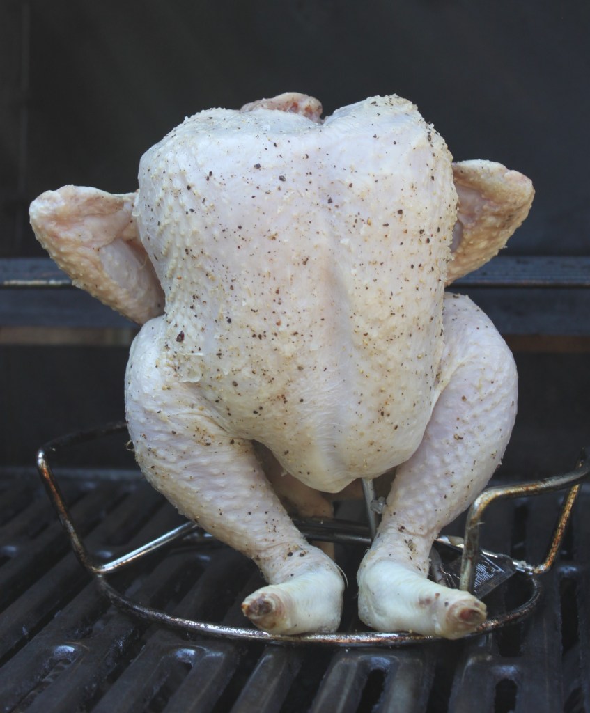 You’ll need a BBQ-safe chicken rack to hold your chicken upright, easily procured online or at most garden centres.