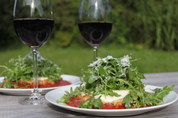 To serve, ladle the tomato sauce onto plates, then nestle the chicken in the sauce. Add a large handful of the dressed rocket on top, then grate a scant dusting of parmesan on top. Serve.