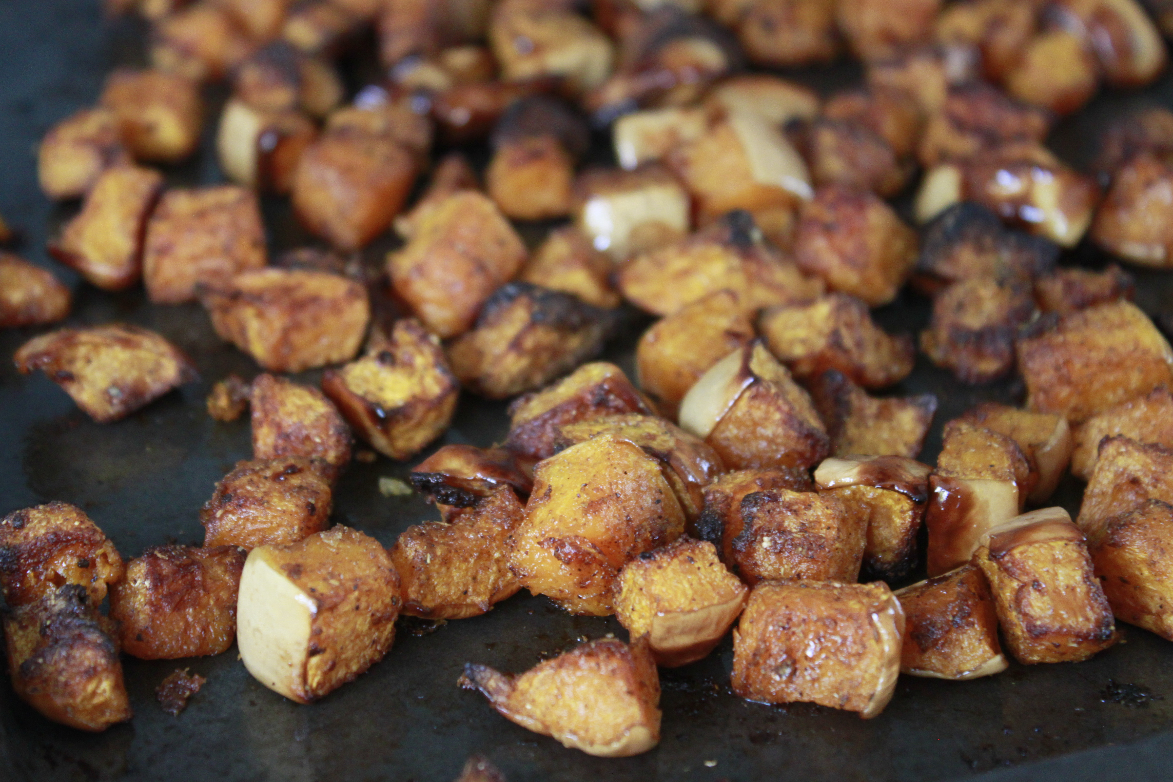 Chop the squash into small (2cm) cubes and transfer to a baking tray.