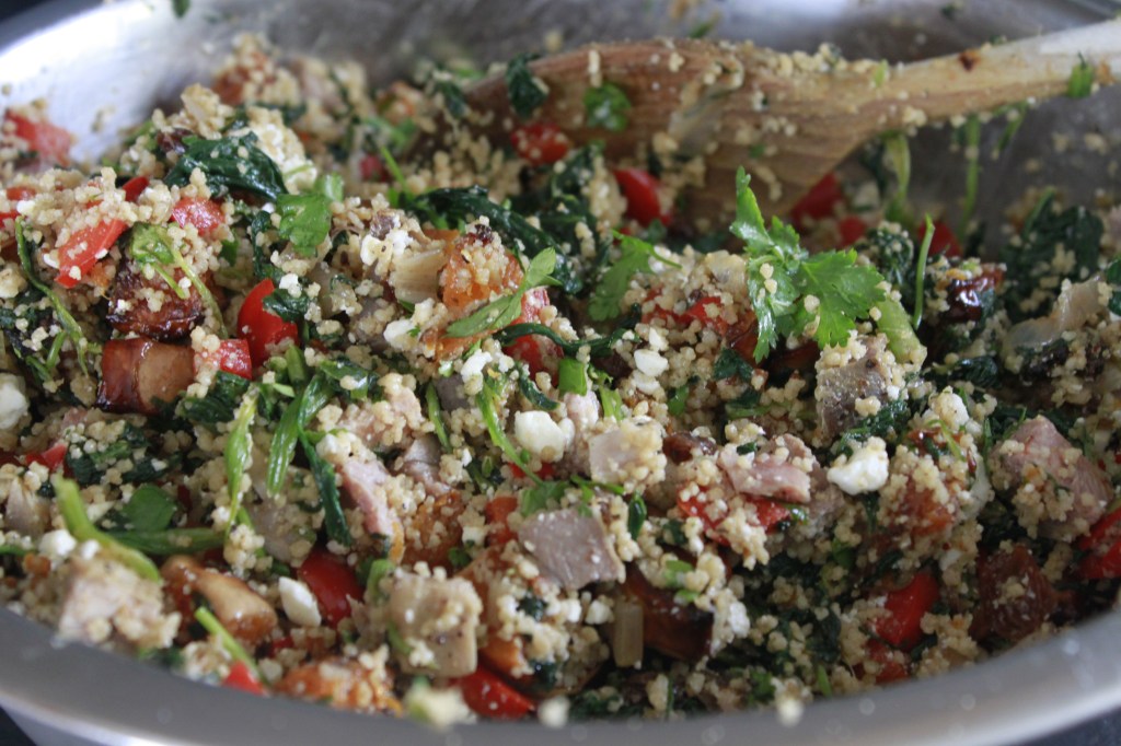 Now you’re ready to bring the filling together. To the couscous bowl, add the roasted squash, the pepper and onion mixture, the cold, chopped lamb, the crumbled feta cheese and the chopped coriander. Mix well. Taste and adjust the seasoning if required. Set aside the filling until ready to assemble the pie.