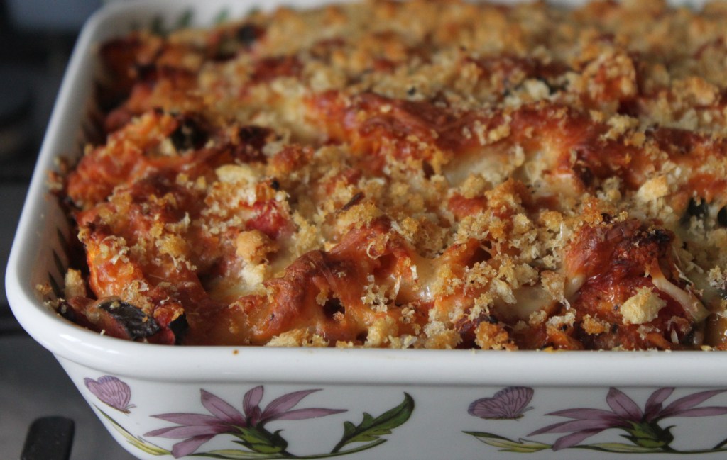 Just before baking, mix the breadcrumbs with a drizzle of olive oil and a pinch of salt and pepper. Sprinkle over the top of the pasta, then bake, uncovered, for 35 – 40 minutes or until golden brown. Serve.
