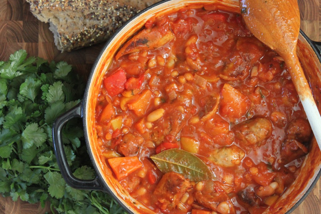Slice the browned sausages on the diagonal into thirds, or quarters if large. Add the sausages to the pot. Use a spoon to poke down the sweet potato and sausages so they are covered in the liquid. Bring to a bubble, then pop on the lid and turn the heat down to low. Cook for 30 minutes, then give it a stir and cook for another 20 – 30 minutes with the lid on, or until the sweet potato is just soft. Remove the lid and cook for a further 10 – 15 minutes, or until thickened to your liking. Check the seasoning, then serve with fresh coriander and crusty bread.